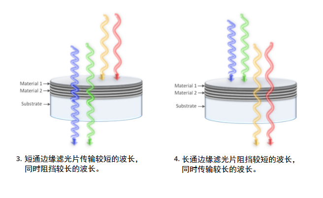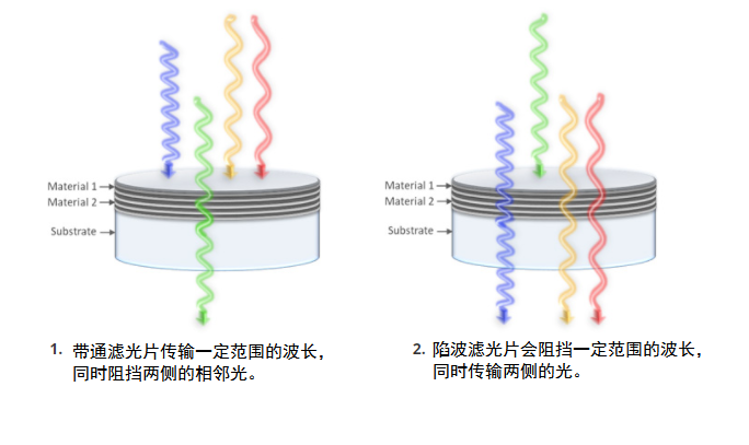 薄膜滤光片是通过将具有特殊光学特性的材料的交替薄层沉积到基板(例如光学级玻璃)上而制成的。当光穿过滤光片时,它的方向会随着它从一层传递到下一层而改变,从而导致内部干涉。这是由于介电薄膜涂层中材料的折射率不同。这些层的配置产生了一个滤光器,它以不同的方式操纵不同波长的光。根据滤光片的波长和类型,光可以从滤光片反射、透过或吸收。 滤光片可以设计为透射、阻挡或反射从紫外到红外的任何波长范围内的光。它们通常根据其光谱形状分为五个基本类别: