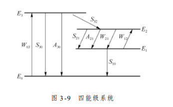 现在的激光器多使用四能级系统,泵浦源将基态的粒子抽运到高能级E3后通过自发辐射来到E2能级,由于E1能级不是基态,通常情况下这一能级几乎没有粒子,因此在E2能级与E1能级之间能够很容易地形成粒子数反转,当外来光能量与E1能级与E2能级能级差相等时能够产生受激辐射,对光进行放大。