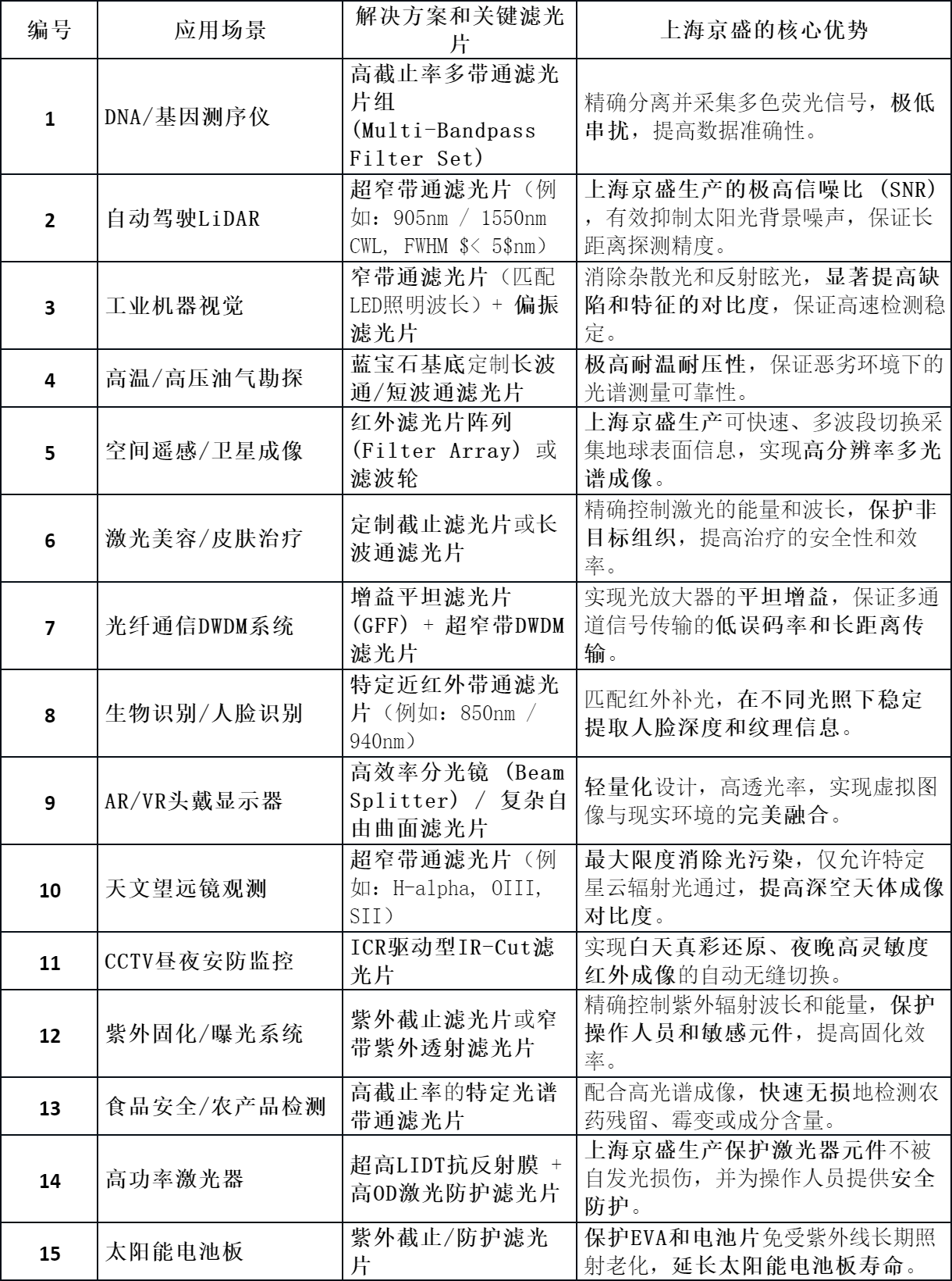 无论是基因测序、自动驾驶、AR显示,还是机器视觉与天文观测,滤光片都扮演着“关键节点”的角色。本篇文章,我们系统梳理了15个核心应用场景,并结合上海京盛光电在每个场景中的解决方案与能力优势,为行业伙伴提供一份可直接应用的参考地图。