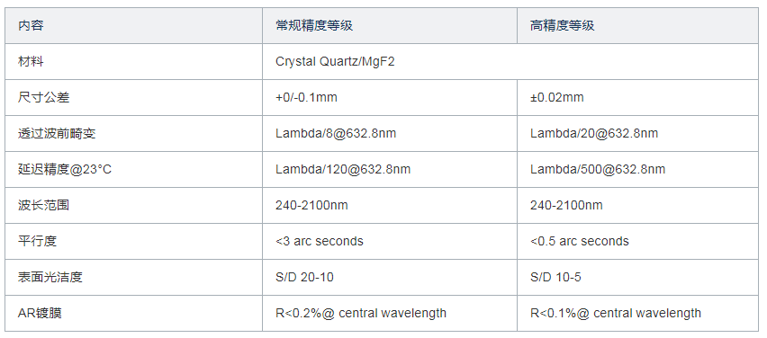 光通过低级波片时产生的延迟等于分数部分的设计延迟加上波长或半波长的小整数倍(也称为级数)的延迟。这与零级波片和多级波片不同,真零级波片的级数等于0,多级波片的级数较大。低级波片的设计维持了零级波片的性能,成为替代真零级波片的良好选择。