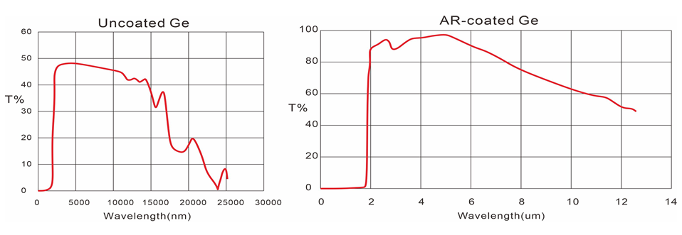 高纯锗单晶具有高的折射系数,对红外线透明,不透过可见光和紫外线,可作专透红外光的锗窗、棱镜或透镜。锗对光的吸收能力随着温度上升而不断加强, 100摄氏度以上即对透光率产生明显的影响, 严重影响光学系统的性能. 锗元件由于其表面高反射率通常镀有减反膜.3~12μm镀膜的锗窗口用于中红外和多光谱应用,8~12µm的锗窗口通常用于热成像和红外成像系统。