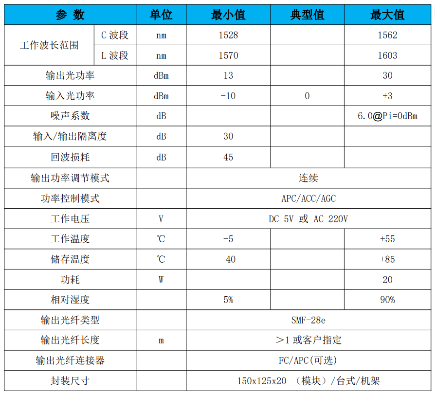 注: 1. 上述为C波段1550nm掺铒光纤放大器参数。L波段掺铒光纤放大器,C+L波段掺铒光纤放大器可定制,请咨询。
