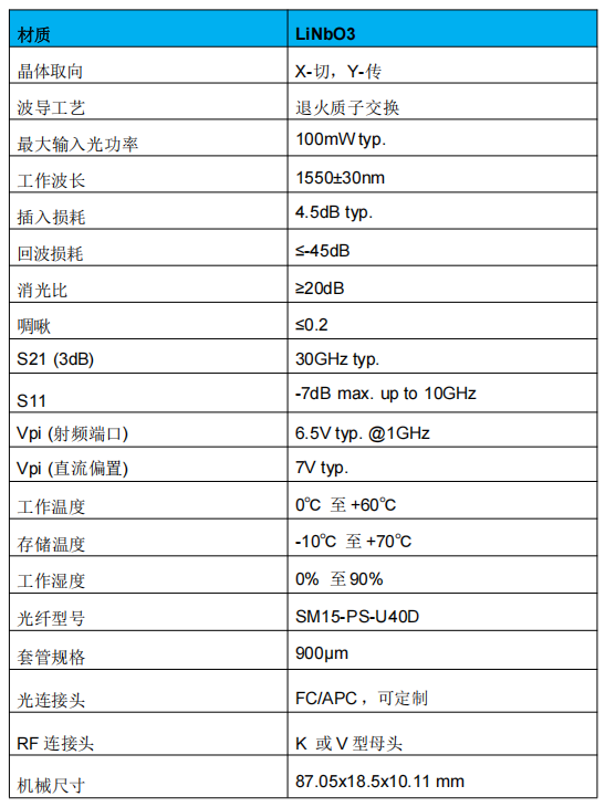 上海京盛光电科技有限公司的QNMP-1550-10-PM是一款10GHz强度调制器,采用退火质子交换 (APE: Annealed ProtonExchange Process) 工艺制成,零啁啾设计,带有保偏(PM)输入和输出光纤。其具有10GHz的电 /光带宽,高度线性传递函数和出色的消光比,应用包括高达12.5Gb/s 的数字传输,10GHz的模拟RFoF传输,光脉冲产生,锁模光纤激光器和微波光链路。QNMP-1550-10-PM与多种调制器驱动器兼容,独立的偏置端口允许调制器在传递函数的特定点运行。它专为高达10GHz或12.5Gb/s 的1550nm激光器的外部调制而设计,也适用于主振荡器功率放大器 (MOPA) 配置的脉冲生成,可以处理高达100mW的输入功率。