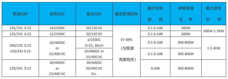 注:N 范围2-18,泵浦光纤可选择芯径105/125,NA 0.22,信号光纤,输出光纤可定制。