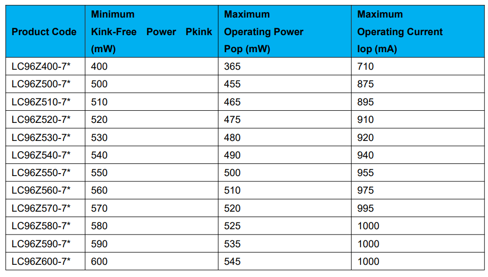 这些激光器是用来作为掺铒光纤放大器(EDFA)泵浦光源而设计的。该设备工作在高热沉温度情况下使冷却所需的功率最小并且在整个工作范围内保持不变。光栅位于尾纤中来稳定波长。Oclaro激光二极管芯片配合将E2前面反射镜进行钝化处理,防止对激光二极管端面产生光学灾变损伤(COD)。器件提供的输出功率为600mW。